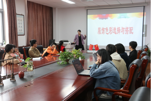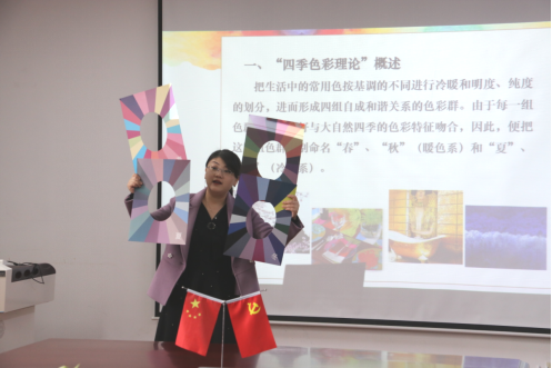 孔老师首先概述了色彩的基本理论知识,并结合示例图片讲解了色彩的三要素:色相、明度和纯度,及它们之间的关系。再从色彩的冷暖、膨胀与收缩、前进与后退三个方面讲解了色彩的视觉心理。随后孔老师利用色环为大家介绍了原色、间色、复色的概念,不同配色方法及其呈现的效果和展示出的意义。最后,孔老师重点从四季色彩理论具体说明了应如何选择符合自身特质的服饰的色彩,参与培训的青年教师们积极的参与到四季色彩匹配的互动中。