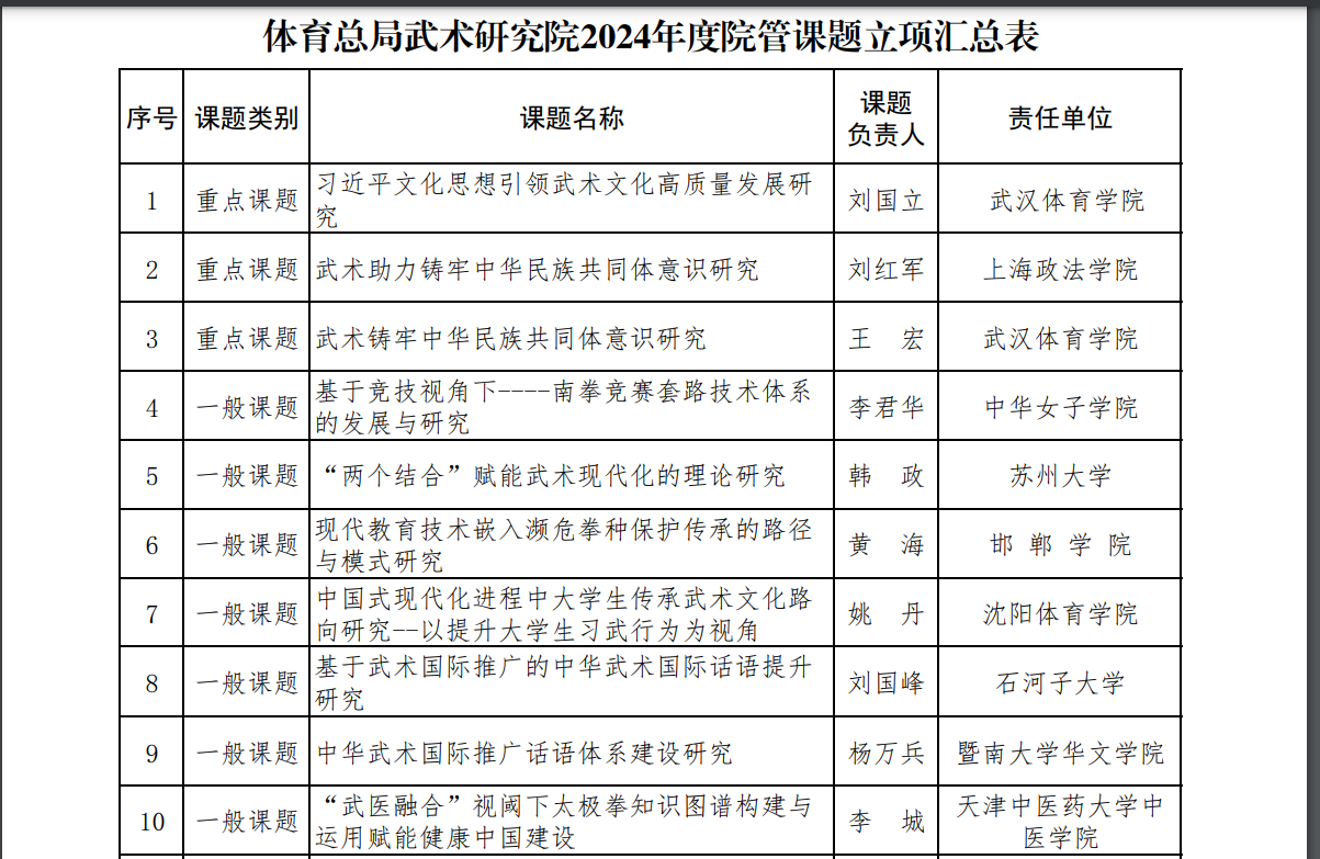 体育总局武术研究院2024年度院管课题立项名单公示
