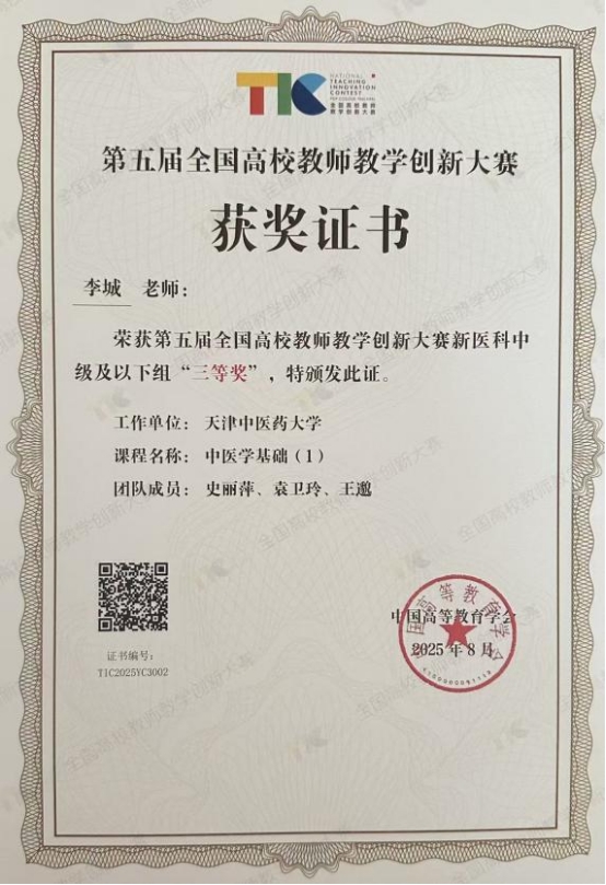 8月16日至19日,由教育部高等教育司指导、中国高等教育学会主办的第五届全国高校教师教学创新大赛全国现场赛在北京理工大学举办。我校中医学院李城老师(团队)荣获新医科中级及以下组三等奖。