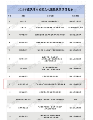 近日,市教育两委对各区教育局、各高校校园文化重点项目建设情况进行了总结,经研究,认定33个项目为2025年度天津市校园文化建设优质项目。我校“五行润心”沉浸体验式中医药文化基地建设项目获评2025年度天津市校园文化建设优质项目。