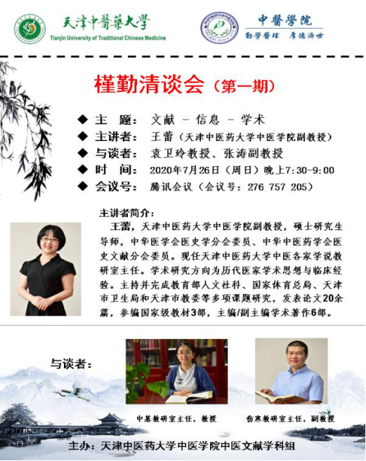 7月26日,由中医学院举办的槿勤清谈会(第一期)圆满落幕,会议以腾讯视频方式线上举行。中医学院党委书记刘毅、院长郭义、副院长王洪武、内经教师主任田露等中医学院教师,天津中医药大学一附院、二附院以及各地教师、研究生、临床工作者近百人参加了此次会议。