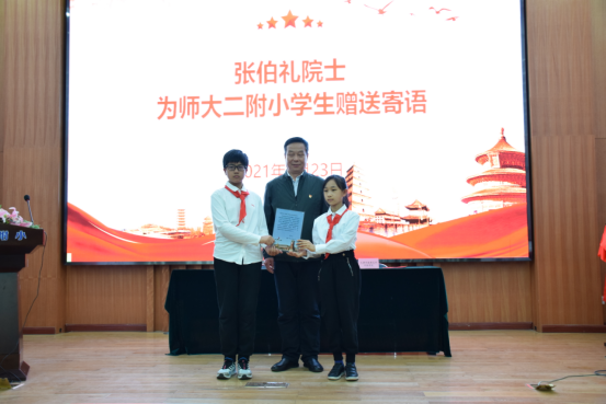 4月23日恰逢世界读书日,“人民英雄”国家荣誉称号获得者、天津中医药大学名誉校长张伯礼院士为师大二附小的同学们送上了亲笔签名的寄语,他指出“适值世界读书日,也希望你们能够快乐学习、认真阅读,多读书、读好书,将来能够成为对国家和社会有益的人才!做合格的社会主义建设者和接班人!”。刘毅书记为学生代表赠送了张伯礼院士的签名寄语。会后,同学们激动地说,“看到张伯礼爷爷给我们的寄语,我们非常骄傲,非常自豪!我们一定不辜负张伯礼爷爷的期望,努力学习文化知识,将来能够成为对国家、对社会有用的栋梁之才!”