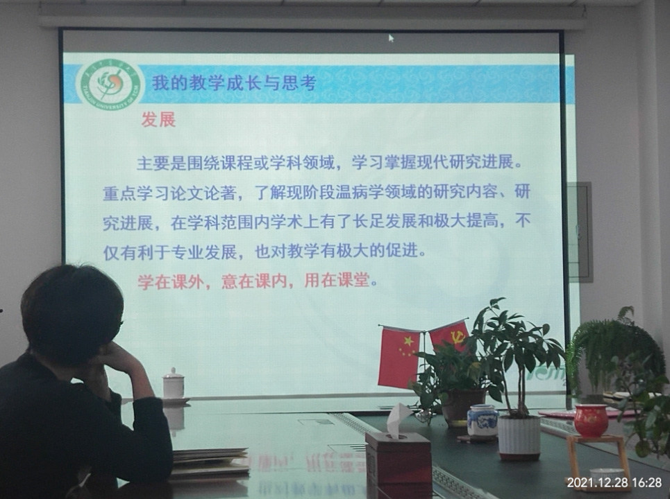 为进一步加深新入职教师对教学工作的认识、做好教学前的多方面准备、减少对教学的畏难感,中医学院于2021年12月28日在槿勤园甲304会议室进行了新入职教师培训第五讲——“我的教学成长与思考”。本次讲座由教学副院长田露主持,由温病教研室张炳立教授担任主讲人,参加本次培训的人员有中医学院2021年新入职教师及其他中青年教师。