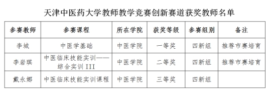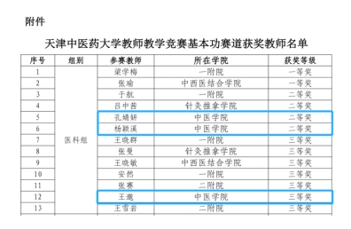 引进天津市顶尖科学家1名。1人荣获第十七届天津市高等学校教学名师,2人荣获校级崇德育人优秀教师特别奖。成立“孟静岩教学名师工作坊”。学院教师荣获第四届全国高校教师教学创新大赛天津赛区新医科组三等奖1项;荣获天津高校第十七届青年教师教学竞赛医科组二等奖1项、三等奖1项。举办院级青年教师教学竞赛,推荐优秀教师参加校级教师教学竞赛,基本功赛道获二等奖2项、三等奖1项;创新赛道获一等奖1项、二等奖1项、三等奖1项。