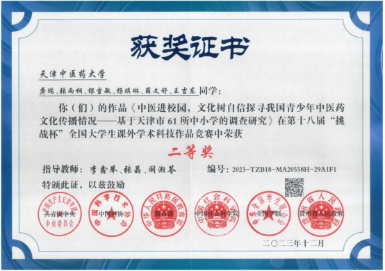 中医学院坚持以精诚学风育人工程为主线,扎实推动学生工作高质量发展,不断创新学生工作载体和途径,学风引领、特色融入,不断巩固学风建设成果。学生在挑战杯、互联网+、科技创新、京津冀中医药高等院校“中医论坛”、文艺展演等比赛中获市级及以上奖项90人次,获各级各类奖学金及荣誉称号1390人次。2024年挑战杯课外学术科技作品竞赛国家级二等奖1项,市级银奖3项,铜奖3项;市级中国国际大学生创新大赛市级金奖1项,银奖3项,铜奖4项;大学生科技创新基金项目国家级立项1项,市级立项5项。