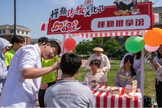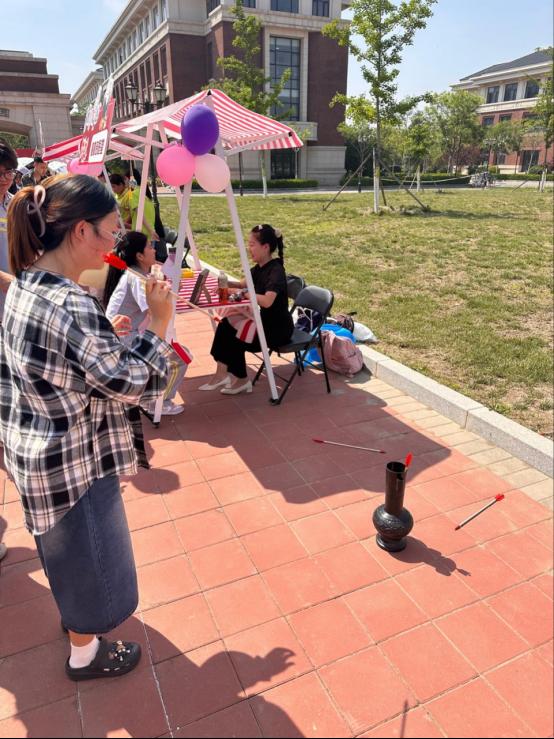 岐黄雅韵游芳园。作为槿勤传统文化节活动之一的“杏林春暖 古韵槿勤”游园会正式拉开帷幕。本次游园会共设置12个特色展位,划分为百草探秘、趣味游戏、传统文化体验、经络养生四大主题区域。参与活动的师生们于投壶游戏间感受古代礼仪的雅致韵味,在漆扇制作时感悟传统工艺的匠心独运,借民乐演奏感知古典音律的灵动魅力,凭推拿按摩感触中医文化的博大精深,于茶饮品鉴中领略中医药膳的独特魅力。这些互动式体验也让传统文化真正"活"了起来,不仅激发了师生对传统文化的兴趣,更增强了他们的文化认同感与民族自豪感。