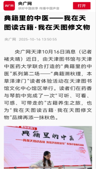 8.立足中医药文化传承与科普惠民,联合天津图书馆举办中医科普宣传活动“典籍里的中医”,为市民奉上了一场生动的中医文化盛宴。系列活动先后被央广网、《中国新闻出版广电报》等权威主流媒体予以报道,形成了良好的行业与社会反响。