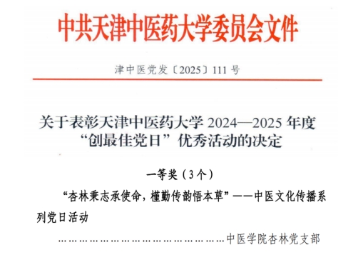 学习宣传贯彻党的二十届四中全会精神,扎实开展深入贯彻中央八项规定精神学习教育,深化作风建设,党建引领发展活力彰显。以标准化建设提升组织战斗力,完成中医学院党委换届。以第三届校党委第一轮巡察为契机,全面推进从严治党向纵深发展。1个党支部获得2024-2025年度天津市教育系统“创最佳党日”优秀活动,1个党支部获得校级“创最佳党日”活动二等奖,获批创建1个党员先锋站。