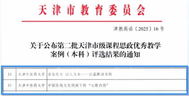 思想政治教育创新提质,“五行润心”沉浸体验式中医药文化基地建设获2025年度天津市校园文化建设优质项目。课程思政深入推进,“安全用方,以人为本--以温脾汤为例”和“中国传统文化视阈下的‘七情内伤’”获评第二批天津市级课程思政优秀教学案例。加强新时代关心下一代工作委员会工作,在2025 年“读懂中国”活动中获天津市征文作品组一等奖。