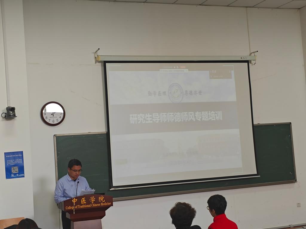 为深入贯彻落实国家关于研究生教育和研究生导师队伍建设的部署要求,进一步加强研究生导师队伍建设,全面落实立德树人根本任务,4月14日中医学院召开研究生导师培训会,围绕师德师风建设、研究生培养环节管理、学位论文与答辩工作、心理辅导与就业指导等内容开展专题培训。中医学院领导班子成员及40余名硕博士导师参会。