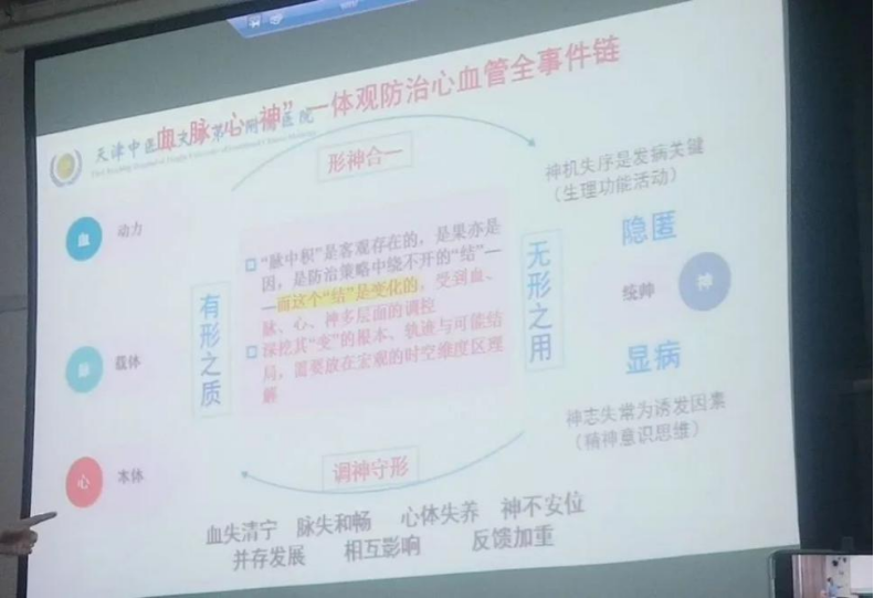 接下来,张军平教授给大家讲解“血脉心神”一体观防治心血管的全事件链,指出了神经失序是发病关键,神志失常为诱发因素,并提出了“脉中积”是客观存在的,是果亦是因,是防治策略中绕不开的“结”,而这个“结”是变化的,受到血、脉、心、神多层面的调控,深挖其“变”的根本、轨迹与可能结局,需要放在宏观的时空维度区理解。