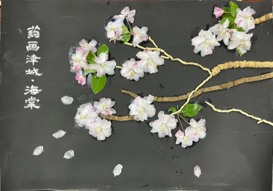 海棠花多作外用,润泽肌肤,《本草纲目拾遗》:“味酸,性寒无毒,和蜜搽面,泽肌润肉,其干捣汁治咽喉痛。”画中树枝部分选用杜仲、芦根、黄芪等。
