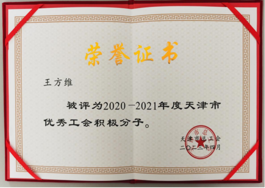 根据总工会关于坚持以习近平新时代中国特色社会主义思想为指导,全面贯彻党的路线方针政策,深入学习贯彻习近平总书记关于工人阶级和工会工作的重要论述特别是加强基层工会建设的重要指示精神,紧紧围绕中心工作,团结动员广大职工听党话、跟党走,进一步激励工会组织和广大工会干部在新征程的伟大实践中埋头苦干、拼搏进取,不断推进工会工作创新发展,为表彰先进、树立典型,天津市总工会对为我市作出突出贡献的先进集体和先进个人进行了表彰。我校中医学院王方维同志荣获2020-2021年度“天津市优秀工会积极分子”称号。
