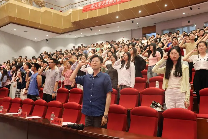 会议最后,在2020级中医4班贾若的带领下,2020级学生全体起立举起右手,诵读《医学生誓言》。